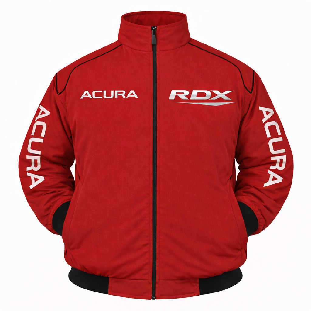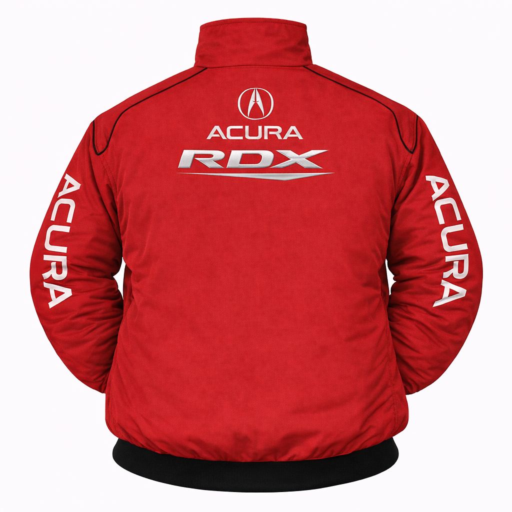 Built for bold performance style, this Acura RDX embroidered racing jacket features strong red color with clean stitched branding for a standout, high-impact look.